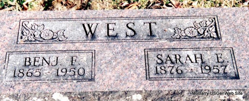 SSW: Sarah E. - Research Note: Benjamin West was the son of Levi West born 1846, Fayette Co., IL and Pernecy Emaline Pyatt. Husband of Sarah (Bouyear) West. According to his death certificate his middle name was Franklin and he died from the effects of cancer of the stomach. - Benjamin Franklin "Frank" West was born Nov. 1865 in IL and died Dec. 26, 1950. His Death Certificate states that his wife Elizabeth (Sarah Elizabeth Bouyear) gave the information. They may have had two older children Cleo and Macy, then William "Homer" West born May 1895 in AR; Leona "Ona" Levi (Lee) born Oct. 1898 died May 29, 1919; Mable Louis West born 1905; Raymond Franklin West born 1907; Marie West born 1911; Ada Belle West born 1914; Donald Lee West born 1919; and Billie West born 1920. Children born after 1900 are from family records. Benjamin Franklin West married Sarah Elizabeth "Lizzie" Bouyear July 22, 1894 in Barry Co., MO by Ransom Haddock, JP. She was the daughter of William M. and Nancy Louisa Garrett Bouyear. - Another list of children: Their children were: Cleo West, Macy West, William "Homer" West, Leoma "Oma" West, Truda West (Mrs. Wayne Elliott), Mable Louise West, Raymond West, Truman West, Marie West, Ada Belle West (Mrs. Lowell Wright), Donald West, and Billie West. | Death Certificate Donna Cooper Census Family Records MO Marriage Records Photo Darla Ball Marbut |