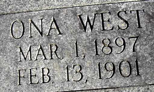 | WEST, Ona | Mar. 1, 1897 | Feb. 13, 1901 | Research Note: Daughter of Benjamin Franklin West and Sarah Elizabeth Bouyear. | Census Phyllis Long Photo Darla Ball Marbut |