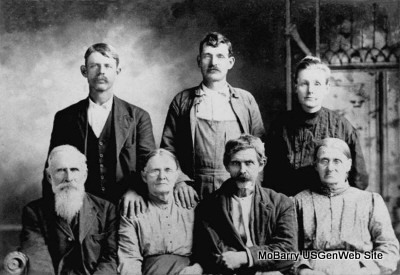 Front Row L-R: George Reed, Sarah (Garrett) (Ball) Reed, Bill Bouyear, his wife, Nancy Garrett (sister to Sarah) Back row L-R: Elbert Ball, John Ben Ball, Dora (Skelton) Ball. Donna Cooper's Research Note: George Reed was a son of Alfred and Mary Frances (Phillips) Reed. Alfred married 1st Mary Frances Phillips, 2nd Elizabeth Davis and 3rd Louisa (Bristow) Simpson. Louisa was the widow of William Simpson. With Alfred's marriage to Louisa (Bristow) Simpson George Reed became a step-brother of Louisa's daughter, America Simpson. America Simpson was one of the great-great grandmothers of Donna Cooper. George Reed was first married to Narcissa West who died Nov 17, 1877 and was buried in Haddock Cemetery near Eagle Rock. After her death he married Sarah Elizabeth (Garrett) Ball, widow of William Valentine Ball. They married Oct 30, 1878, in Barry County. Sarah Garrett and William Valentine Ball were great-great grandparents of Darla and Georgia. Submitted in 2006 by Donna Cooper, Georgia (Ball) Farwell & Darla (Ball) Marbut. Photo belongs to Georgia Farwell |