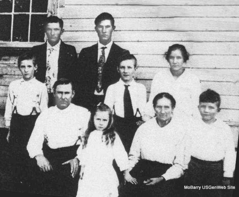 This photo belongs to Mrs. Edith Stever, Prier, Davis - now deceased. Submitted in 2009 by Darla Ball Marbut Joseph Prier Family in 1918 Front Row: Joseph, Naomi, Mary, and Marion. Middle Row: Tice, Warner, Tina. Back Row: John and Leonard. George Prier, like his father Wesley, was also about the first land owners and voters in Henry Co., Iowa. George’s occupation as given on the census records is variously listed as farmer, carpenter, and mason. He came to Barry County, MO, by way of Bates Co., MO. He arrived in Barry County in about 1870 with his wife Mary Freeze Prier and their daughter Frances Elizabeth Prier. Crane Creek Twp., 1880 Barry Co., MO Census #392 Pryer (Prier) George W. 54 (1826) Mary 38 France E 11 Joseph 9 John w 7 Adam 5 Simon L 3 Roland W 1 George and Mary settled in the Gunter community near Butterfield, Mo. He died in about 1882 and is buried in the Bullington Cemetery in an unmarked grave. Mary Freeze Prier died at her son’s home (Joseph Prier) at Eagle Rock, MO. She was taken to the Bullington Cemetery to be buried beside her husband. Joseph and Mary Shull Prier had a farm near Gunter and traded it for a farm on the Roaring River at Eagle Rock, MO. With a lot of hard work they raised their family on the 120 acre farm. Their daughter, Ora, (my grandmother) told of their move to Eagle Rock. She said they brought a wagon load of their belongings and Grandpa Joe returned to Gunter for another load. It became dark before he returned. She said they were scared as they only had a few candles to light. It was a strange place and no "Popa". They raised a huge garden and all the children helped with the work. This is their family: Descendants of Joseph Thomas Prier 1 Joseph Thomas Prier 1871 - 1952 b: April 22, 1871 in Butterfield, Barry Co., MO d: July 23, 1952 +Mary Melvina Shull 1869 - 1960 m: May 19, 1895 in Barry Co., MO by James T. Pennell JP b: November 23, 1869 in Tazewell, Claiborne Co., TN d: November 07, 1960 2 Ora May Prier 1896 - 1993 b: April 04, 1896 in Butterfield, Barry Co., MO d: March 28, 1993 +Charles Elmon Ball 1896 - 1974 m: January 14, 1915 in Eagle Rock, Barry Co., MO b: May 26, 1896 in Eagle Rock, Barry Co., MO d: June 25, 1974 2 Eva Jane Prier 1897 - 1978 b: October 28, 1897 in Barry Co., MO d: September 03, 1978 +Truman Eldon Ball 1895 - 1972 m: January 14, 1917 in Barry Co., MO b: March 17, 1895 in Barry Co., MO d: March 24, 1972 2 Leonard Joseph Prier 1899 - 1987 b: February 12, 1899 in Butterfield, Barry Co., MO d: September 08, 1987 +Virgie Easley 1905 - 2000 m: August 29, 1926 in Barry Co., MO b: February 27, 1905 in Barry Co., MO d: July 21, 2000 2 John Washington Prier 1900 - 1981 b: August 14, 1900 in Barry Co., MO d: April 18, 1981 +Arizona Marie Skelton 1905 - 1947 m: February 15, 1924 in Barry Co., MO b: February 15, 1905 in Barry Co., MO d: December 15, 1947 *2nd Wife of John Washington Prier: +Louise Lowery 1912 - 2000 m: March 01, 1949 in Joplin, Jasper Co., MO b: March 28, 1912 in Barry Co., MO d: July 21, 2000 2 Tina Opal Prier 1903 - 1943 b: April 18, 1903 in Barry Co., MO d: July 07, 1943 +Loren Everett Easley 1900 - 1987 m: November 23, 1923 in Barry Co., MO b: June 04, 1900 in Eagle Rock, Barry Co., MO d: November 10, 1987 2 Warner Elisha Prier 1906 - 1998 b: June 24, 1906 in Butterfield, Barry Co., MO d: February 01, 1998 +Mary June Easley 1909 - 2005 m: December 05, 1928 in Butterfield, Barry Co., MO b: June 23, 1909 in Barry Co., MO d: February 08, 2005 2 Ticon Truman Prier 1908 - 1990 b: October 19, 1908 in Barry Co., MO d: July 13, 1990 +Allie Maudie Easley 1916 - 1996 m: May 03, 1935 in Barry Co., MO b: May 09, 1916 in Barry Co., MO d: March 24, 1996 2 Marion Francis Prier 1911 - 1973 b: June 27, 1911 in Barry Co., MO d: July 14, 1973 +Edith Lyle Stever 1918 - m: June 27, 1938 b: March 10, 1918 in Mano, Barry Co., MO 2 Naomi Irene Prier 1913 - 2000 b: February 12, 1913 in Barry Co., MO d: February 08, 2000 +Gerald Thompson 1915 - m: January 01, 1938 in Wheaton, Barry Co., MO b: July 01, 1915 in Barry Co., MO Most of the family is buried in the Munsey Cemetery near Eagle Rock, Barry Co., MO. Submitted in 2009 by Darla Ball Marbut |