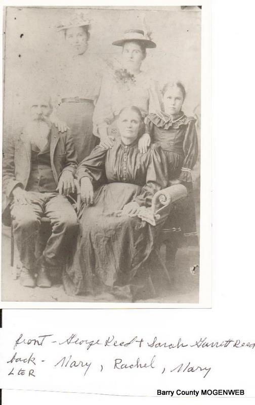 Descendants of George C. Reed 1 George C. Reed b: Nov 07, 1842 in Barry Co., MO d: Jun 24, 1921 in Barry Co., MO Burial: Munsey Cemetery, Barry Co., MO +Narcissa West b: Sep 30, 1847 m: Oct 04, 1865 in Warrick Co., IN d: May 18, 1877 in Eagle Rock, Barry Co., MO Burial: Old Haddock Cemetery near Eagle Rock, Barry Co., MO 2 James Wesley Reed b: Aug 07, 1866 in Warrick Co., IN d: May 29, 1933 in Barry Co., MO Burial: Maplewood Cemetery, Exeter, Barry Co., MO +Bethena Roller b: Oct 1873 in Barry Co., MO m: Oct 05, 1890 in Barry Co., MO d: Sep 1950 in Barry Co., MO Burial: Maplewood Cemetery, Exeter, Barry Co., MO 2 Ellis Reed b: Jan 08, 1868 in Barry Co., MO d: Jan 26, 1868 in Barry Co., MO 2 John H. Reed b: Oct 08, 1869 in Barry Co., MO d: Oct 08, 1869 in Barry Co., MO 2 William Alfred Reed b: Apr 03, 1870 in Barry Co., MO +May Annie b: Mar 03, 1895 d: Jun 14, 1986 in Barry Co., MO Burial: Chitwood Cemetery, Barry Co., MO 2 Sarah Caroline Reed b: Dec 10, 1873 in Barry Co., MO d: Jan 1892 in Barry Co., MO 2 Amos Reed b: Mar 17, 1877 in Barry Co., MO d: Jul 04, 1879 in Barry Co., MO *2nd Wife of George C. Reed: +Sarah Elizabeth Garrett b: Feb 28, 1845 in Talladego Co., AL m: Oct 30, 1878 in Barry Co., MO d: Feb 03, 1936 in Barry Co., MO Burial: Munsey Cemetery, Barry Co., MO 2 Mary Frances Reed b: Feb 28, 1880 in Barry Co., MO d: Aug 05, 1933 +Cox b: Abt. 1880 *2nd Husband of Mary Frances Reed: +Thomas Lorenzo Plummer b: Jul 21, 1853 in Dyersburg, Dyer Co., TN m: Jan 15, 1900 in Green Forest, Carroll Co., AR d: Oct 13, 1925 in Jonesboro, Craighead Co., AR 2 Rachel Louise Reed b: Feb 01, 1882 in Barry Co., MO d: Jan 11, 1962 in Barry Co., MO +Dock Goins b: Oct 27, 1872 in Greene Co., IN m: Jan 30, 1900 in Barry Co., MO d: Dec 27, 1921 in Barry Co., MO Burial: Seligman Cemetery, Seligman, Barry Co., MO 2 Martha Reed b: Dec 31, 1886 in Barry Co., MO +Orth Porter b: Abt. 1886 m: Aft. 1911 Submitted in 2011 by Patricia Garrett |