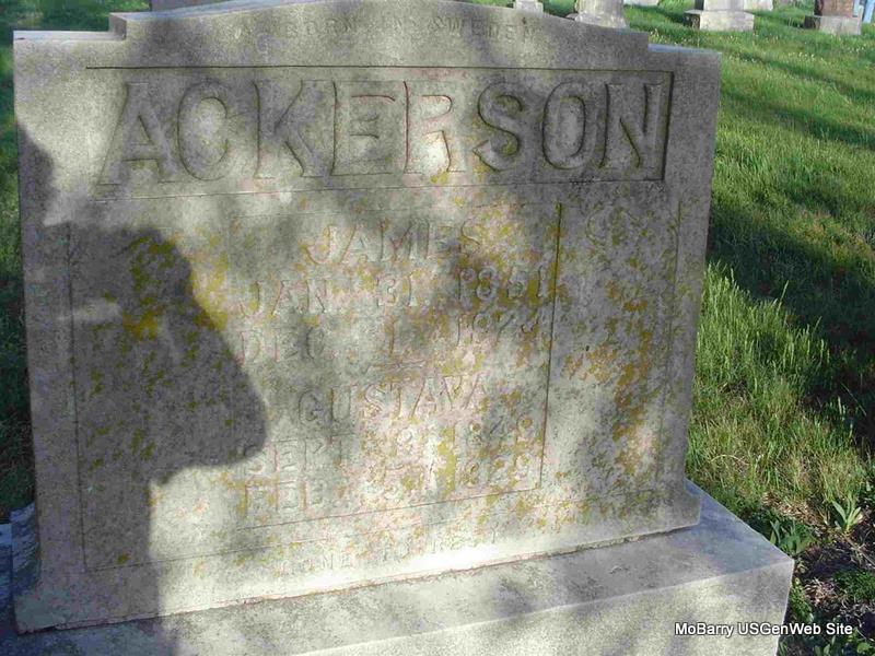 Inscription: "Born in Sweden" - Research Note: Son of Peter Ackerson born Sweden and mother not named on the death certificate. Mrs. Nellie Veith of Monett, MO was the informant on the death certificate. - - James Ackerson first married Helena Matilda Fyr on Jan. 31, 1878 in Lawrence Co., MO. James Ackerson second married Gusta Peterson on Feb. 2, 1883 in Lawrence Co., MO. | Death Certificate MO Marriage Records Phyllis Long Photo Donna Cooper |