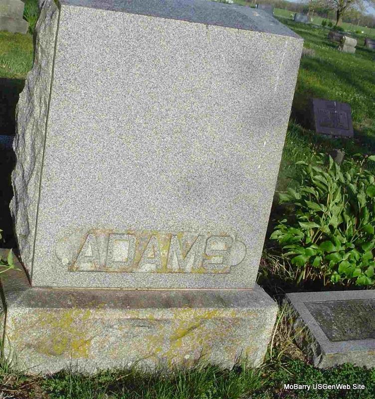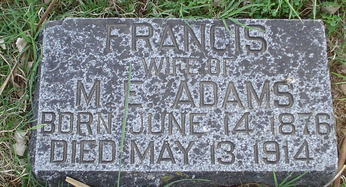 | ADAMS, Francis (TATE) | June 14, 1876 | Mar. 13, 1914 | Inscription: "Wife of M. E." - Research Note: Francis was a daughter of John Douglas and Mary Elizabeth (Westfall) Tate. Wife of Matthew Eugene Adams. 1910 Census, Frances and Matthew were in Franklin Co., WA. He died there in 1943. | Census Phyllis Long Photo Donna Cooper |
