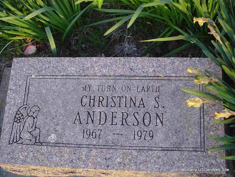 Research Note: Funeral home records state that her cause of death was diabetic melitis, nephritis, age 76 years, 2 months, and 21 days old and that she was buried at King's Prairie. Parents not named on the death certificate, only father as Lindquist. She was widowed. Mrs. Albert Anderson of rural Verona, MO was the informant. She first married Carl John Anderson and second Henry A. Anderson. - Obit - Mrs. Anderson Dies - Funeral Services for Old-time Resident of Globe Community Held Tuesday -- Mrs. Christina Anderson, 76, old-time resident of the globe Community, east of Monett, died at her home at 6 o'clock Saturday evening. She had been ill only a short time of apoplexy and complications. Funeral services were conducted at the Globe M. E. church at 2 p.m. Tuesday afternoon conducted by the Rev. William Gray. Burial was in the Kings Prairie Cemetery. Mrs. Anderson was born in Sweden on June 11, 1857. She came to the United States in 1890 and for a number of years lived in Brooklyn, NY. She was married to Carl John Carlson in 1901 and moved that year to the farm near Verona Where she spent the remainder of her life. Following Mr. Carlson's death, she was married to Henry A. Anderson on Mar. 3, 1918. Mr. Anderson died several years ago. She is survived by one nephew, August Peterson of New Milford, NJ, and by three stepchildren, C. H. Anderson of St. Louis, Mrs. J. A. Nelson of Chicago and Alfred A. Anderson of near Verona. | Funeral Home Records Donna Cooper Death Certificate Phyllis Long |