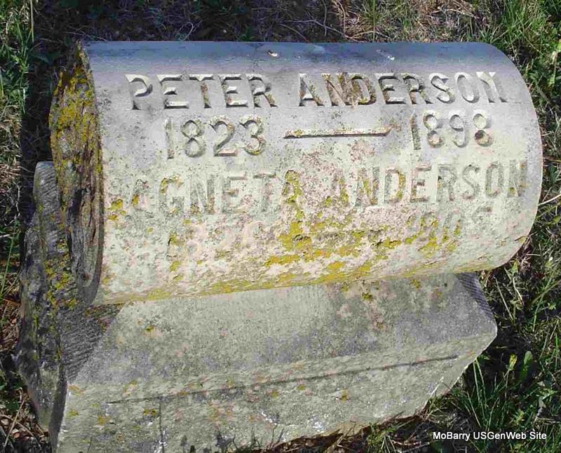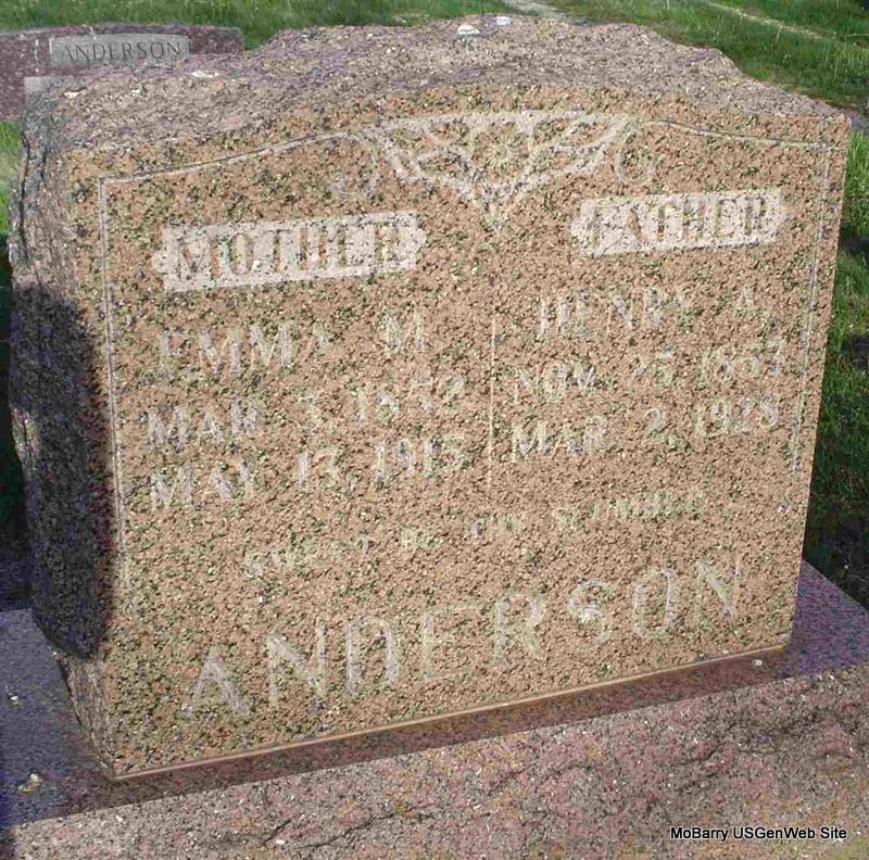 | ANDERSON, Emma Matilda (ANDERSON) | Mar. 3, 1852 | May 13, 1915 | SSW: Henry A. - Research Note: Funeral home records state that she was a daughter of Peter Anderson who was born in Sweden. She died at age 63 years, 2 mos., and 10 days old from cancer of the stomach. Wife of Henry A. Anderson. Daughter of Peter Anderson born Sweden and mother not named on the death certificate. Alfred A. Anderson of rural Verona, MO was the informant on the death certificate. | Death Certificate Phyllis Long Funeral Home Records Photo Donna Cooper |