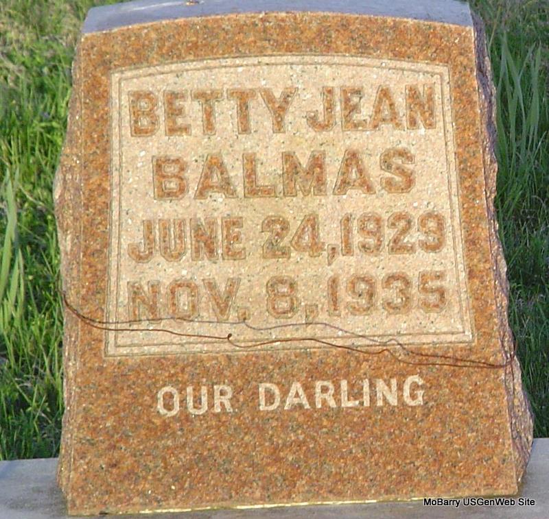Inscription: "Our Darling" - Research Note: Betty was a daughter of Eli Balmas born Barry County and his wife Lola Violet Jackson born Barry Co., MO. She died of bronchial pneumonia. | Death Certificate Phyllis Long Photo Donna Cooper |