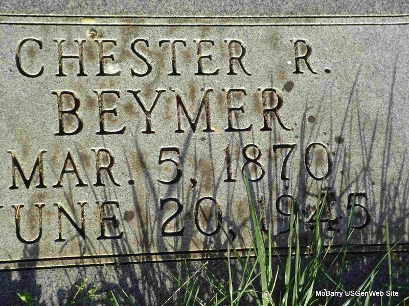 Research Note: Son of James Henry Beymer and Marguerite Ellen Whitacre. Chester Pomeroy Beymer, age 20, married Maggie Kershaw, age 26, on Feb. 1, 1863 in Monett, Barry Co., MO. James H. Beymer, father of Chester, gave consent. Will E. Hankins vouched for the age of Maggie Kershaw. - November 10, 1917, Saturday, Cassville Democrat - Chester Beymer of near this city received a message on the 2nd, informing him of the death of his brother Malachia Beymer at Deering, Kan., leaving a wife and two children. He was raised on Kings Prairie this county. He was 44 years old. Chester went there to attend the funeral and returned Monday. - August 7, 1920, Cassville Democrat - Myron Beymer who was visiting his father and family, Chester Beymer of the Forest Grove neighborhood, was surprised Tuesday night by 80 persons visiting the Beymer home, who were treated to ice cream and a general good time was had. | Online Newspapers MO Marriage Records Census Phyllis Long Photo Donna Cooper |