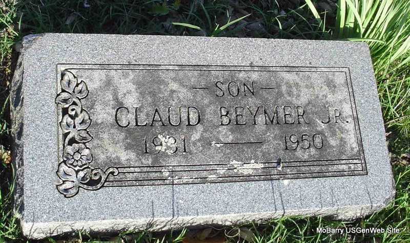 Inscription: "Son" - Research Note: Never married. Son of Claude Beymer Sr. and Icy Goodnight. He was a clerk for the Business Mens Assurance. Claude Beymer Sr. of Valley Falls, KS was the informant on the death certificate. | Death Certificate Phyllis Long Photo Donna Cooper |