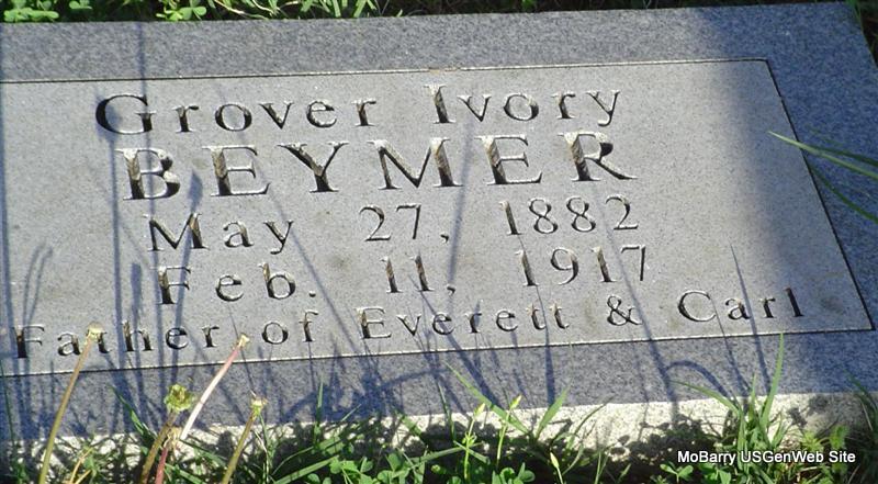 Inscription: "Father of Everett and Carl" - Research Note: Son of James Henry Beymer and Marguerite Ellen Whitacre. He first married Mattie C. Davis October 25, 1904 in Barry County, Missouri. He second married Bessie Harman on June 14, 1908 in Joplin, Jasper Co., MO. - Cassville Democrat Saturday, February 24, 1917 - Grover Beymer died at Pueblo, CO, this week and the remains were shipped back to Monett and were entered in Kings Prairie cemetery. He was raised in that vicinity and was a brother of J. M. Beymer residing in the Forest Grove neighborhood northeast of the city 5 miles. He left a wife and two children to mourn his passing. | On Line Newspaper Cassville Democrat Brother's DC Census Phyllis Long Photo Donna Cooper |
