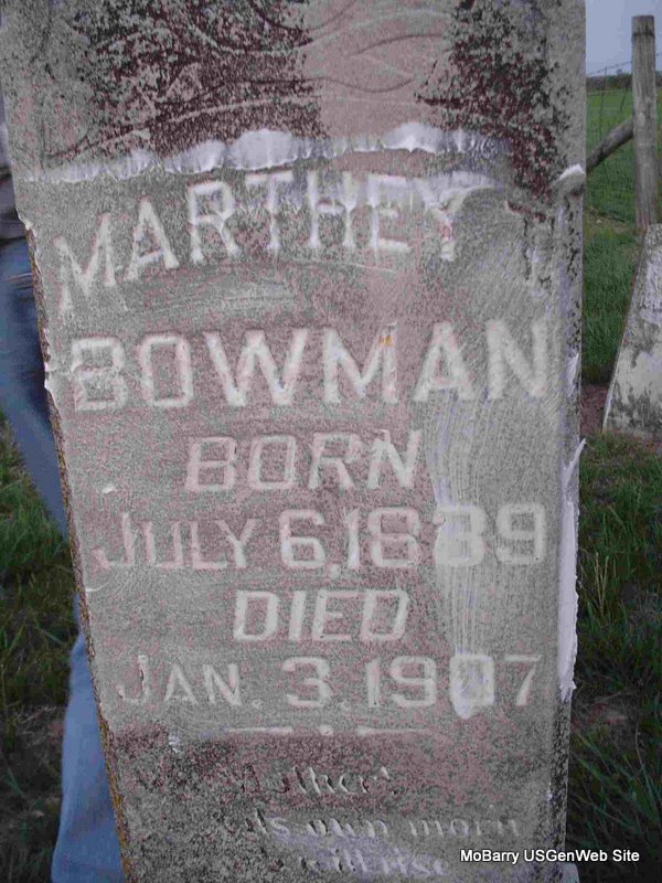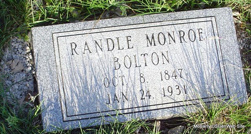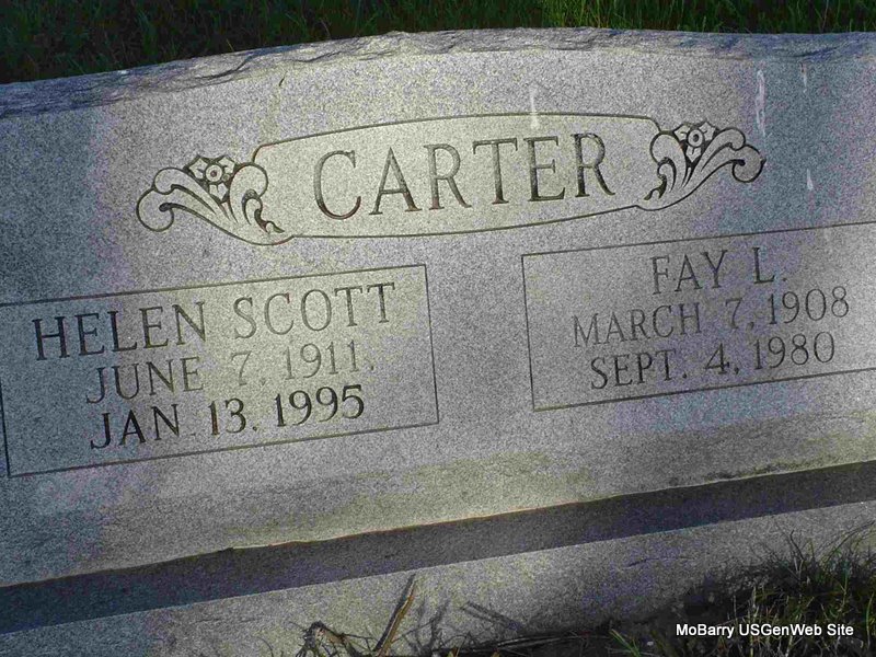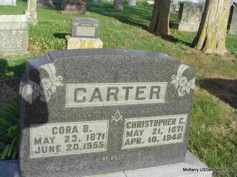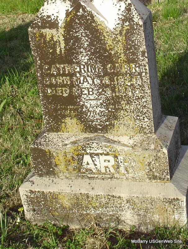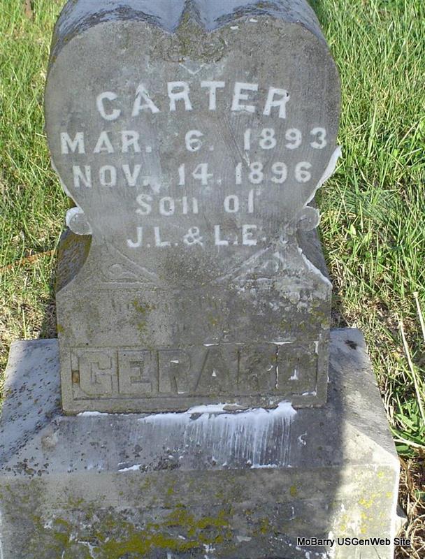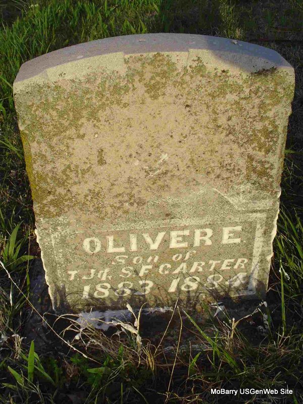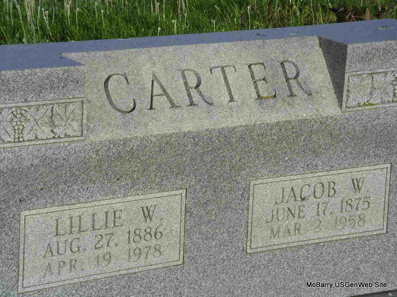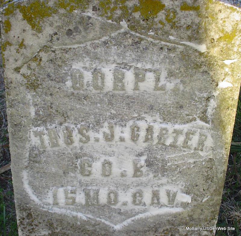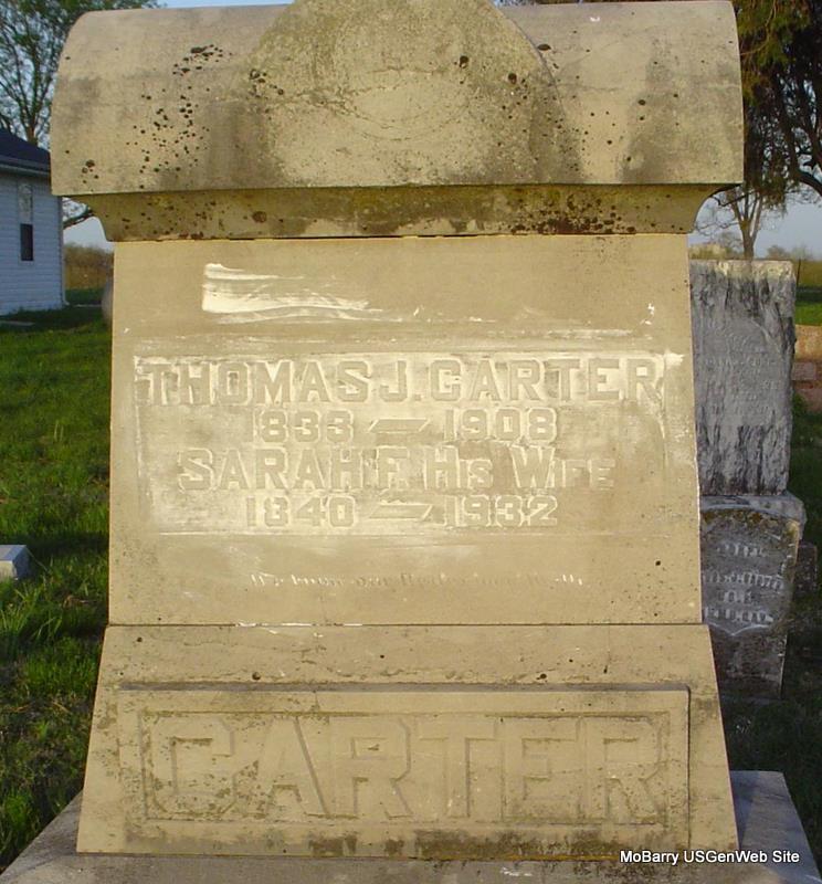 SSW: Sarah F. - Research Note: Son of Thomas and Rebecca (Jackson) Carter. - Goodspeed's 1888 History of Barry Co. - Thomas J. Carter, a farmer residing four and one-half miles east of Monett, MO was born on Dec. 17, 1833 in TN and is the only child of Thomas and Rebecca (Jackson) Carter. Thomas Carter, Sr., was a native of TN, in which state he lived and died. After his death, his widow, who was born in NC, married John Sullivan. Soon after Mr. Sullivan and wife removed from TN to Greene Co., MO; thence to Lawrence Co., and later to Stone Co., where Mrs. Sullivan died. Mr. Sullivan is now living in Barry Co. To them were born nine children of whom William, John and Thomas J. Carter entered the Union Army in 1861, and was in service until the close of the war in 1865. He served in the Home Guards and State Militia until he joined Co. B. 15th MO Cavalry. He participated in the engagement at Springfield, when the Federal troops were attacked my Marmaduke. Mr. Carter was captured once, and held prisoner for a short time in SW MO. In politics he is independent, voting for the man and not for the politician. He cast his first presidential vote for Fillmore. In 1859 he was united in marriage with Sarah F. Wooley, who was born Dec. 12, 1840, and to them have been born eleven children: Charlotte, born Sept. 2, 1860; William F. S., born Dec. 6, 1861; T. J. Jr., born Dec. 20, 1863; Joseph L. born May 3, 1866; J. D., born Aug. 14, 1868; Christopher C., born May 21, 1871; Sarah C., born Sept. 9, 1873; Jacob W., born June 17, 1875; H. W., born Sept. 22,, 1877; M. C. died Feb. 17, 1880; Emery O., died Oct. 7, 1884. All are members of the Methodist Church. Mrs. Sarah F. Carter's father was a native of IL, born Dec. 12, 1816; thence moved to Stone Co., MO. He died Jan. 5, 1855. Her mother was born in Simpson Co., KY, then moved to Stone Co., MO; thence moved to Christian Co., ten miles south of Springfield, MO, where she now lives. Mr. Carter has a farm of 200 acres, of which 120 acres are nicely situated and well improved. - Military Stone - Inscription: "CORPL - CO B 15 MO CAV" | Goodspeed's History Phyllis Long Photo Donna Cooper |