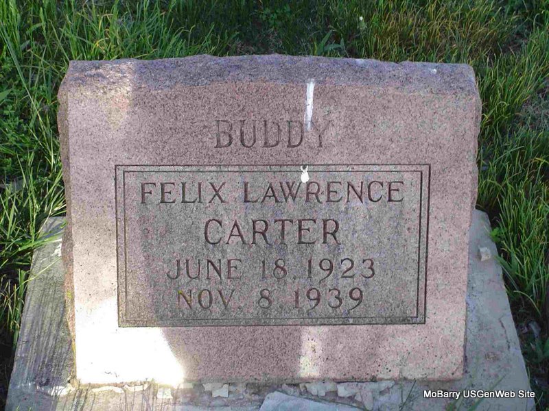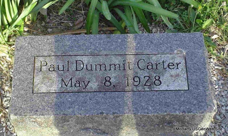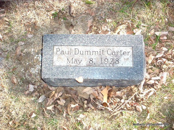 Research Note: Stone has one date on it. Died at birth. - Obit: Mr. and Mrs. Floyd Carter of Tulsa, Okla., are the parents of twins born Tuesday, May. 8. One of the babies died shortly after birth. The body was brought to Monett Wednesday afternoon on the number 4, and burial was made in the Kings Prairie cemetery. Mr. Carter (Floyd) is the son of Mr. and Mrs. Chris C. Carter who reside on Kings Prairie. - Funeral home records state an infant died May 8, 1928. He was a son of William Floyd Carter who was born in MO and Myrtle May Dummit who also was born in MO. Cause of death was given as a premature birth. - Another Photo | Online Obit Photo Wilma Fields Funeral Home Records Photo Donna Cooper |