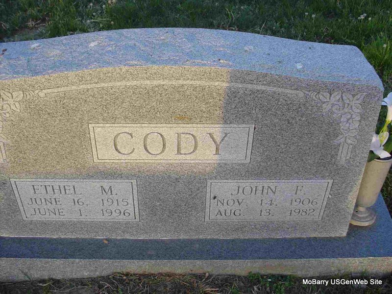 | CODY, John F. | Nov. 14, 1906 | Aug. 13, 1982 | SSW: Ethel May - Research Note: Son of Edmond M. Cody born Ireland and Frances Moore born OH. | Census Phyllis Long Photo Donna Cooper |