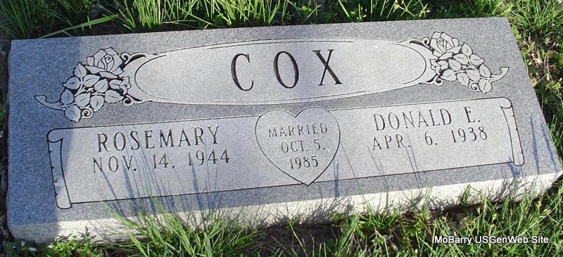 | COX, Donald E. | Aug. 6, 1938 | No Date | SSW: Rosemary - Inscription: "Married Oct. 5, 1985" | Photo Donna Cooper |