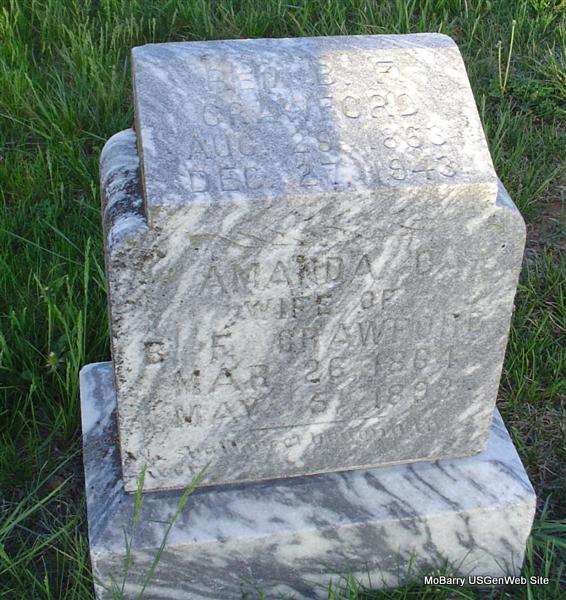 SSW: Benjamin Franklin - Inscription: "His Wife" - Research Note: Wife of Benjamin Franklin Crawford. Amanda Badget married Ben F. Crawford on Aug. 5, 1886 in Barry Co., MO. Daughter of George Badget, buried at Bethel Baptist Cemetery and Matilda Lance. | Census Phyllis Long Photo Donna Cooper |