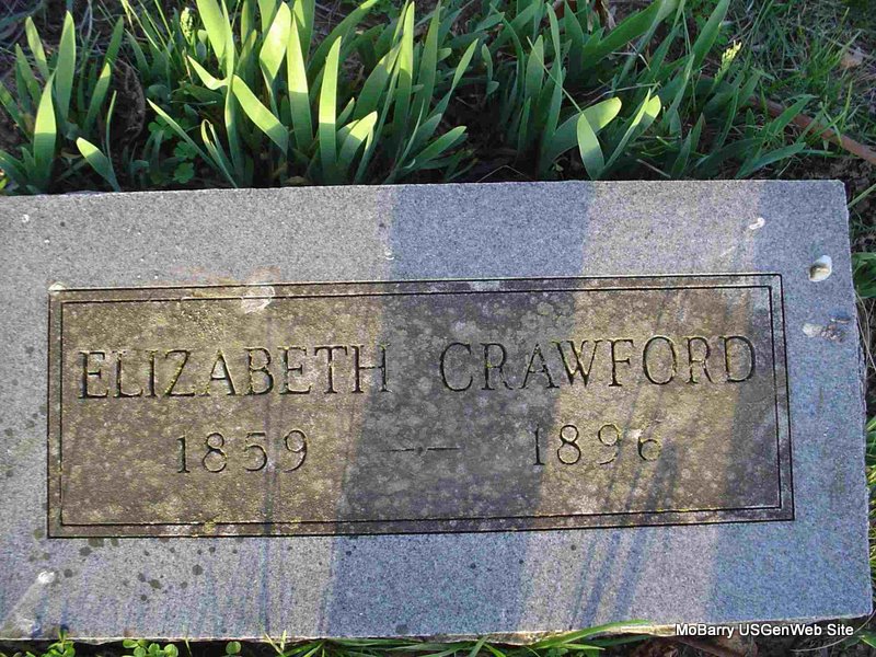 | CRAWFORD, Elizabeth | 1859 | 1896 | Research Note: Sarah Elizabeth Badget married John M. Crawford on Oct. 16, 1881 in Barry Co., MO. John H. Crawford, father of John M., gave consent. Daughter of George Badget, buried at Bethel Baptist Cemetery and Matilda Lance. | MO Marriage Records Census Phyllis Long Photo Donna Cooper |