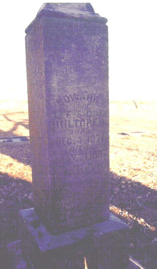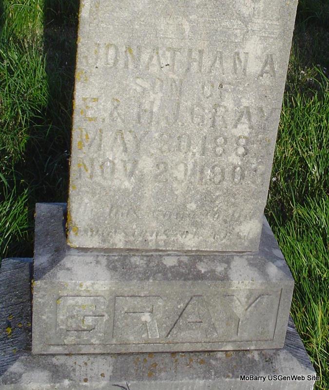 | GRAY, Jonathan A. | May 30, 1883 | Nov. 29, 1908 | Inscription: "Son of E. and H. J." - Research Note: Funeral home records state that Jonathan A. Gray died of T. B., single and a Methodist, age 20 years, 5 months, and 19 days. He was buried at King's Prairie cemetery. Son of Eli Gray and Harriet Jane Clark. | Funeral Home Records Photo Donna Cooper |