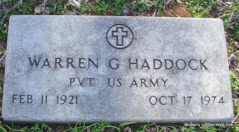 Research Note: Father of Donna (Haddock) Cooper. He was a minister at Forest Park Baptist Church on Range Line in Joplin, MO, at the time of his death. He was a son of Samuel Sanders and Gertrude (Addington) Haddock. The main stone has the wrong year of birth. Military stone has the correct date. - Another Stone - Military Stone - Inscription: "Pvt. US Army" | Note Photo Donna Cooper |
