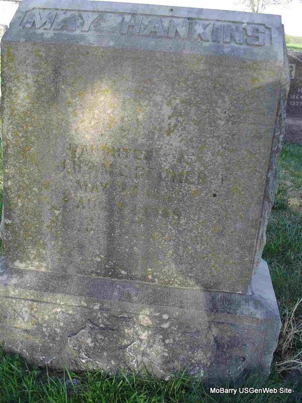 Inscription: "Dau. of J. A. and C. B." - Research Note: Six year old daughter of Joseph A. and Celia Belle (Baze) Jackson. Donna L. Baze provides a birth date of Jan. 9, 1870. Maggie was buried in Kings Prairie Cemetery as is her mother, Celia ( Baze)Jackson - Four Newspaper obituary clippings found in the family Bible of Joseph A. and Celia Belle (Baze) Jackson: 1. "Ethel-daughter of Joe and Celia Jackson, died at Monett, MO., Sunday, October 10, 1897, after a short illness of one week of malarial fever." - 2. "The little six year old girl of Joe Jackson died at the home of the parents on Marshall Hill on Sunday last of Malaria fever. The internment took place Monday afternoon at the Kings' Prairie cemetery. funeral services were conducted by Rev. W. T. Farley. The parents have the sympathy of all in their sorrow." - 3. "Maggie Ethel Jackson, daughter of Mr. and Mrs. Joe Jackson, died of malaria fever Sunday morning and was buried Monday afternoon. Rev. Farley officiated." - 4. "Mr. and Mrs. Joe Jackson desire to express their thanks to the friends and neighbors who kindly lent them a helping hand during their recent bereavement." | Note Photo Donna Cooper |
