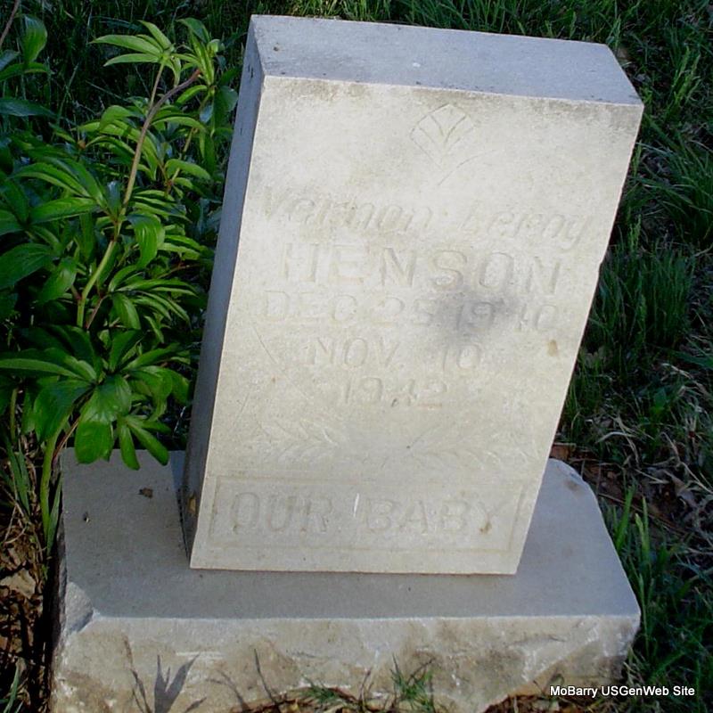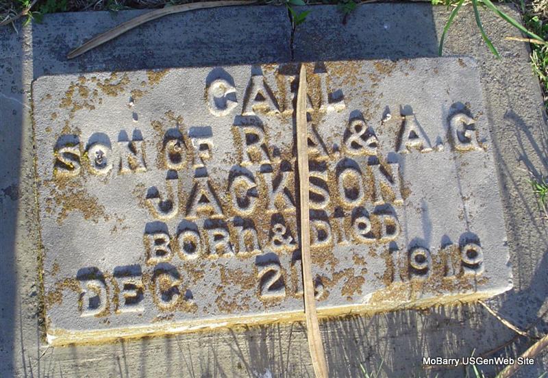 Inscription: "Son of R. A. and R. G." - Research Note: Father was Roscoe Andrew Jackson born Monett, mother was Anna Grace Reddington born Monett according to Callaway Funeral Home records. A. Jackson of Monett, MO was the informant on the death certificate. | Death Certificate Phyllis Long Photo Funeral Home Records Photo Donna Cooper |
