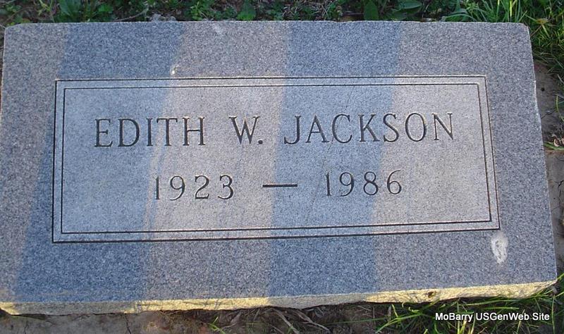 | JACKSON, Edith W. (WHIPPLE) | 1923 | 1986 | Research Note: Wife of Vedas Conway Jackson. Edith Whipple, age 18, married Vedas Jackson, age 23, on Feb. 7, 1942 in Mt. Vernon, Lawrence Co., MO. Maybe daughter of Alvin A. Whipple and Nancy E. Springer. | MO Marriage Records Phyllis Long Photo Donna Cooper |