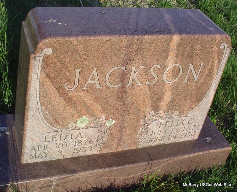 SSW: Leota - Research Note: Son of Thomas E. Jackson and Fountain Bolen. Oscar Jackson of Galena, MO was the informant on the death certificate. Felix Jackson married Nicie Henderson on Nov. 17, 1889 in Barry Co., MO. His father, Thomas E. Jackson gave consent for Felix to marry. Nicie Louisa Henderson is buried at Bethel Baptist Cemetery, died in 1895. Felix C. Jackson second married at age 30 to Leota Marbut, age 25, on Nov. 20, 1901 in Barry Co., MO. | Death Certificate MO Marriage Records Phyllis Long Photo Donna Cooper |