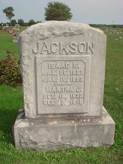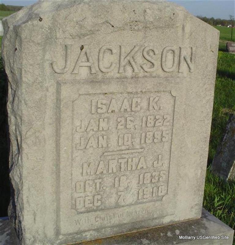 | JACKSON, Isaac K. | Jan. 26, 1822 | Jan. 10, 1895 | SSW: Martha J. - Research Note: Son of William Jackson and Charlotte Kearns. Isaac filed for his pension on Jan. 11, 1890. - Military Stone - Inscription: "Co. C, 76th Reg., MO MIL" - Another Photo | Census C. W. Pension Records Phyllis Long Photo Wilma Fields Photo Donna Cooper |