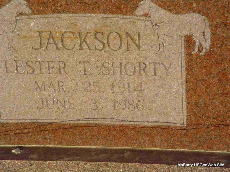 | JACKSON, Lester T. "Shorty" | Mar. 25, 1914 | June 3, 1986 | Research Note: Son of Charles H. Jackson and Goldie Mae Lowder. 1940 Census Lester is married to Rhoda "Clarcie" Jackson and they are living with his parents. Possible second marriage: Lester T. Jackson, age 32 from Monett, Barry Co., MO, second married Anna Louise Capozzi, age 30 from St. Mary's, Anglize Co., OH, on Dec. 17, 1945 in Sebastian Co., AR. | Census AR Marriage Index Phyllis Long Photo Donna Cooper |