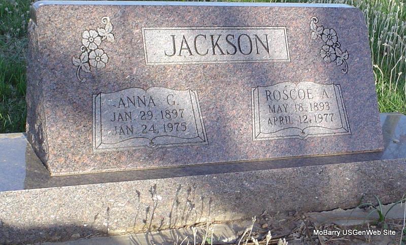 | JACKSON, Roscoe A. | May 18, 1893 | Apr. 12, 1977 | SSW: Anna G. - Research Note: Son of William Allen Jackson and Eva May Stribling. - July 4, 1912, Thursday, Cassville Republican - R. A. Jackson of Kings Prairie township was badly shocked by a bolt of lighting Thursday afternoon of last week while plowing corn on his farm. One of the horses that he was driving was killed and the other was badly shocked. - Cassville Republican, Thursday, May 1, 1919 - Kings Prairie: Roscoe Jackson has been plowing corn. - Cassville Republican, Nov. 9, 1939 - Mr. and Mrs. Norman Jackson visited his parents, Mr. and Mrs. Roscoe Jackson and children Sunday. - Same paper: The chili supper at Roscoe Jackson's Tuesday night was a decided success. - Same Paper: Mr. and Mrs. Delbert Hilton and Roscoe Jackson visited their sister, Mrs. Frank Epperly at Hardin, Okla., last week. | Online Newspapers Census Phyllis Long Photo Donna Cooper |