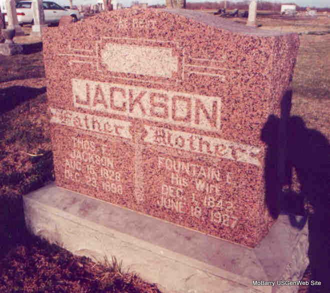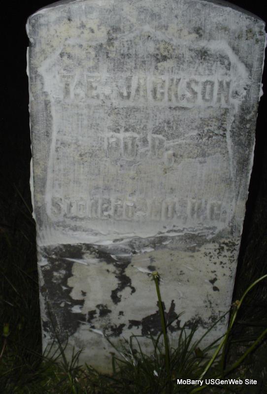 | JACKSON, Thomas Edgar | Aug. 15, 1828 | Dec. 23, 1898 | SSW: Fountain - Research Note: Son of William Jackson and Charlotte Kearns. Thomas E. Jackson first married Hester Elizabeth Dye on Sept. 18, 1857 in Stone Co., MO. He second married Fountainella (Bolen) O'Neal on Apr. 9, 1862 in Stone Co., MO. - Military Stone - Inscription: Co. B. Stone Co. MO HG" - Another Photo | MO Marriage Records Census Phyllis Long Photo Wilma Fields Photo Donna Cooper |