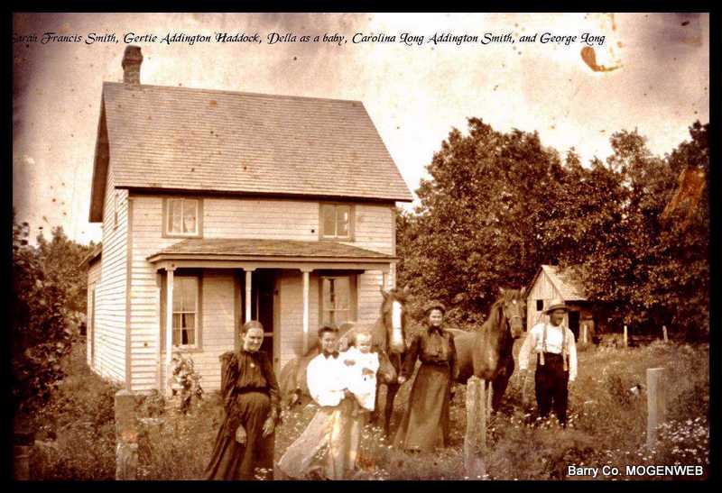 The older couple is my gr gr grandparets, George and Sarah Frances (Smith) Long; my gr grandmother, Melvina Caroline "Carrie" (Long) Addington (was later married to Asher Smith from a different Smith family than her mother's Smiths.); and the young girl is my grandmother, Gertrude Addington Haddock and she is holding her first child, Della Haddock who was my dad's sister. George Long was the son of John Dake and Lavina Bellah Long. And Sarah Frances Smith Long was the daughter of Jiles and Sarah Frances (Singleton) Smith. Submitted in 1999 by Donna Cooper |