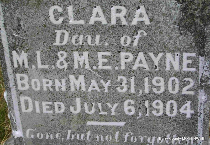 | PAYNE, Clara | May 31, 1902 | July 6, 1904 | Inscription: "Dau. of M. L. and M. E. Payne" | Photo Deceased Beverly Sweeney |