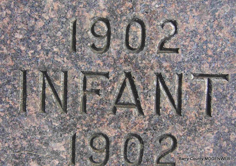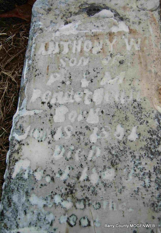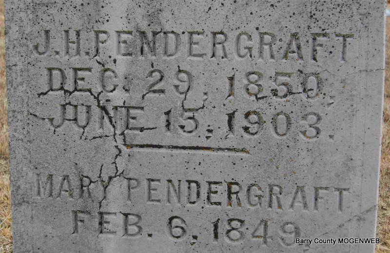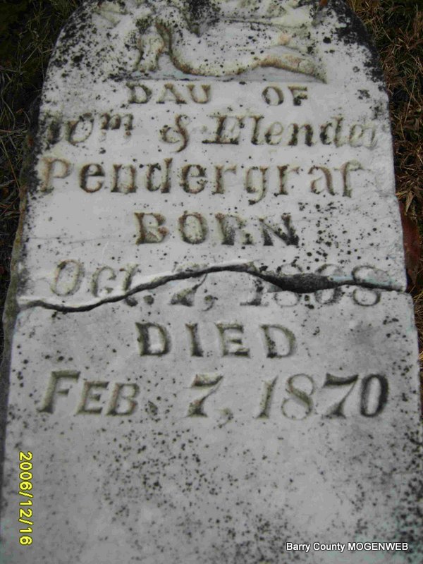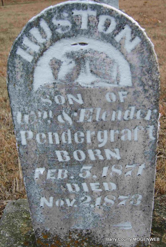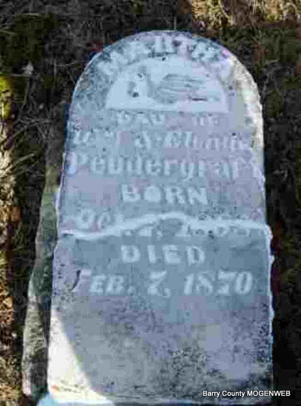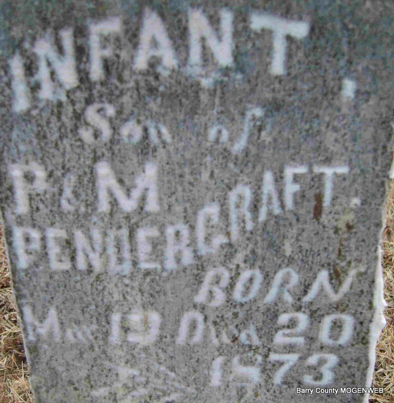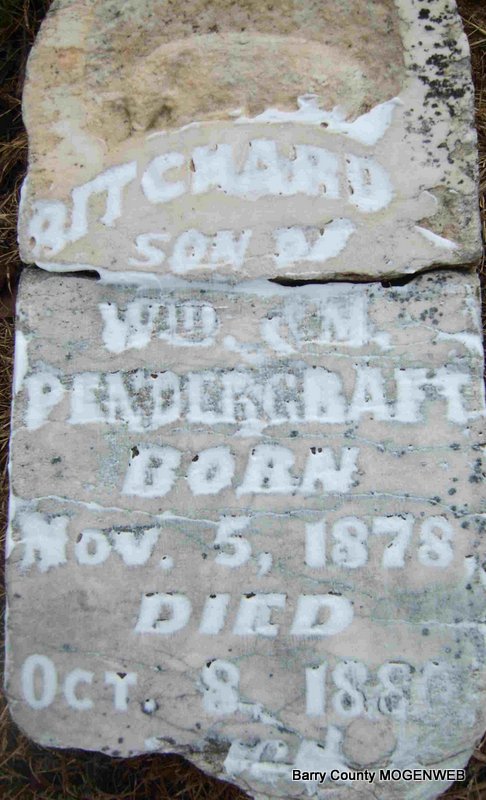 | PENDERGRAFT, Richard Johnson | Nov. 5, 1878 | Oct. 8, 1886 | Inscription: "Son of Wm and M. Pendergraft" - Research Note: Listed on the 1880 Barry Co., MO, Federal Census. Richard Johnson Pendergraft was a son of William P. Pendergraft and Melvina (Murray) (Sons) Pendergraft. | Headstone Betty Erickson Census Phyllis Long Photo Deceased Beverly Sweeney |