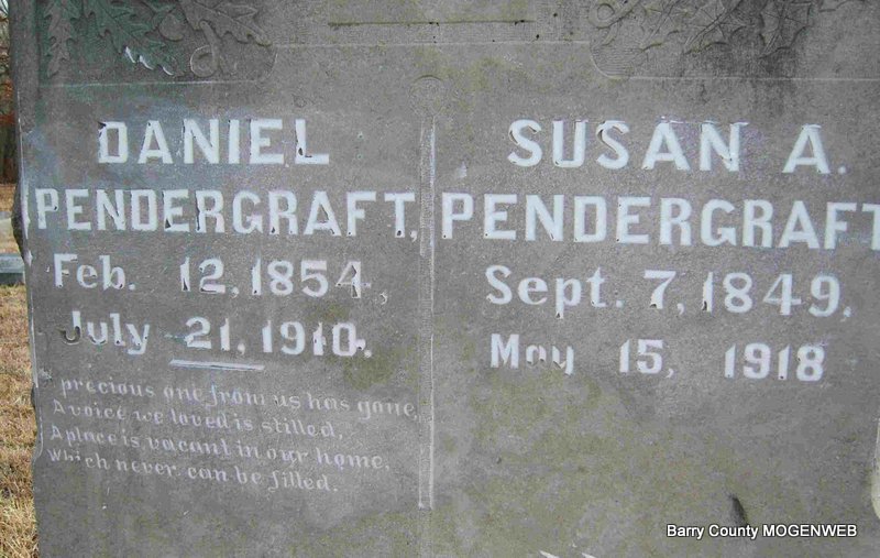 SSW: Susan - Research Note: His death certificate reads that his father was William Pendergraft, born in NC. His mother was given as Ellen Roller, born in VA. General Brixey of Seligman, MO, gave the information. Daniel Barry Pendergraft, husband of Susannah A. Banks. - July 28, 1910, Thursday, Cassville Republican - Daniel Pendergraft died July 21, at his home near Seligman of paralysis, aged about 60 years. He had been in bad health for some time. Daniel Pendergraft was a brother of the late G. W. Pendergraft. The two brothers died within a week of each other. Three brothers of the family have died during the past year. - Nov. 10, 1910, Thursday, Cassville Republican - Walter Pendergraft and Dave Brewer were here Saturday. They took a handsome monument to the New Salem cemetery to be erected at the grave of Daniel Pendergraft. W. M. Adams did the monumental work. | Death Certificate Donna Cooper Online Obit Online Newspapers Phyllis Long Photo Deceased Beverly Sweeney |