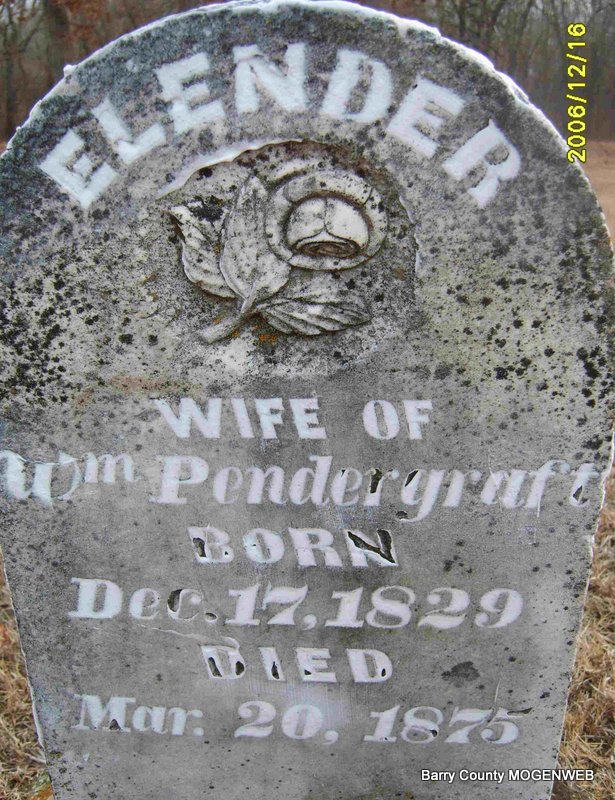 Research Note: Spouse: Elender (Roller) Pendergraft, separate stone. William P. Pendergraft, son of Henry James Pendergraft and Mary Oliver Beaver. Married first Elender Roller, Jan. 31, 1850, married second Melvina (Murray) Sons, Oct. 7, 1875 in Barry Co., MO. | Family Cindy Marcell Note Phyllis Long Photo Deceased Beverly Sweeney |