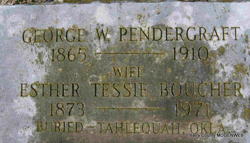 | PENDERGRAFT, George W. | 1865 | July 1910 | SSW: Esther Tessie - Research Note: Son of William Pendergraft and Eleanor Roller. His wife was Esther Tessie (Boucher) Pendergraft 1873 - 1971 - burial in Tahlequah, OK. - Betty's posting had Esther spelled as Ester, stone reads otherwise. - Cassville Republican, Weekly Paper, Thursday, August 31, 1893 - Prof. G. W. Pendergraft, of Purdy, who was last week married to Miss Ester Boucher, will make his future home in Greensburg, Kansas, where he is employed as the principal of the public school of that place. - July 28, 1910, Thursday, Cassville Republican - Misses Anna, Stella and Mabel Boucher went to Seligman last Saturday to attend the funeral of their brother-in-law, G. W. Pendergraft. They were accompanied home Saturday night by Mrs. Pendergraft and two children, who will remain indefinitely. Pierce City Leader - July 28, 1910, Thursday, Cassville Republican - Daniel Pendergraft died July 21, at his home near Seligman of paralysis, aged about 60 years. He had been in bad health for some time. Daniel Pendergraft was a brother of the late G. W. Pendergraft. The two brothers died within a week of each other. Three brothers of the family have died during the past year. - July 17, 1913, Thursday, Cassville Republican - New Salem News: Mrs. G. W. Pendergraft and daughter, Miss Dixie, and son, Carl, of Normangee, Texas, are visiting at Elbert Pendergraft's this week. - Same paper - Mrs. G. W. Pendergraft, daughter, Miss Dixie and son, Carl of Normangee, Tex, are visiting relatives near Seligman. They will visit Cassville friends before returning. Miss Dixie Pendergraft was recently ranted a state life certificate in Texas. She will teach her first term this fall and winter. - October 2, 1913, Thursday, Cassville Republican - New Salem News: Carl, son of Mrs. G. W. Pendergraft, went to Purdy Wednesday night after spending a few weeks at Elbert Pendergrafts. - October 23, 1913, Thursday, Cassville Republican - New Salem News: Mrs. G. W. Pendergraft and son, Carl, are visiting relatives in this part. They are en route to Texas. - Same paper - New Salem News: Albert Pendergraft and family, Mrs. G. W. Pendergraft and son, Carl, spent Sunday with foster Price and family. - Cassville Democrat, May 22, 1920 - By a letter from Mrs. G. W. Pendergraft of Devine, Texas, in which she says she is very pleasantly located not far from San Antonio. That her daughter and husband were with her. That her son Carl with the State Highway Commission of New Mexico, ____ a draughtsman and is located in Santa Fe. She said the women of Texas had a large part in showing Ex-Senator Bailey the "heart of Texas" democracy. She said she and daughter are planning to visit Missouri, sometime during the year. Missouri still is "home" to us she wrote. They will receive a warm welcome from many relatives and friends. | Headstone Betty Erickson Online Newspapers Phyllis Long Photo Deceased Beverly Sweeney |