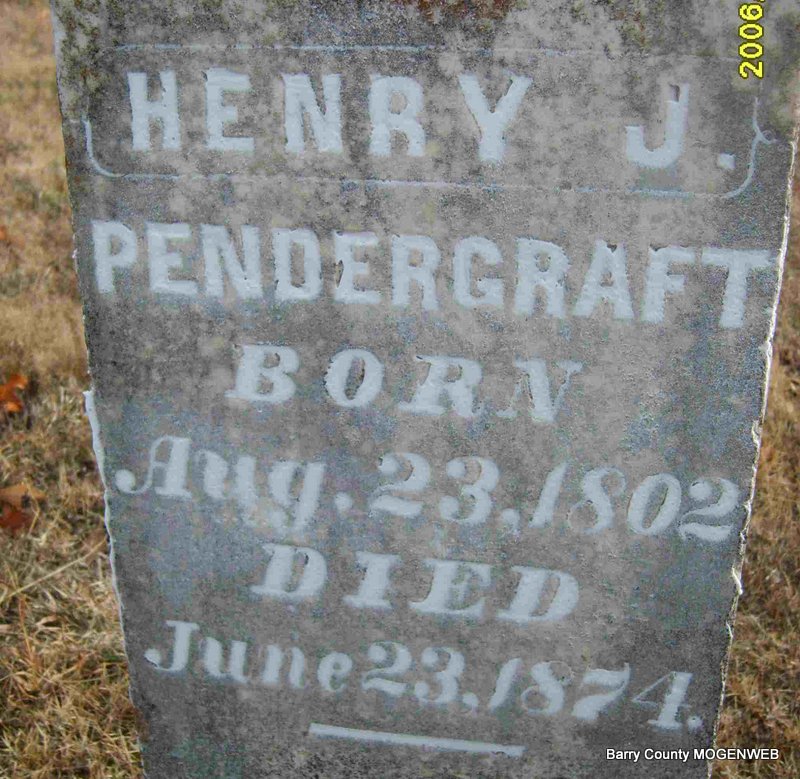 | PENDERGRAFT, Henry J. | Aug. 23, 1802 | June 23, 1874 | Research Note: Family knowledge - spouse of Mary O. Beaver, separate stone. Henry James Pendergraft, born NC, was a son of Joseph Jobe Pendergrass, Sr. (Pendergraft) and Mary James Reel. He and Mary had 9 children. | Note Cindy Marcell Note Phyllis Long Photo Deceased Beverly Sweeney |