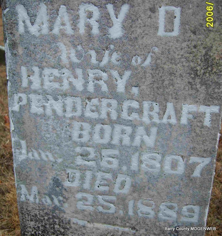 Research Note: Wife of Henry Pendergraft. Stone appears to read Jan. 25, 1807 and not Jan. 26th as posted by Cindy. Daughter of William Martin Beaver and Mary Rebecka Hardcastle. - 1870 Census, Sugar Creek Twp., Barry Co., MO - Henry Pendergraft, farmer, age 67, NC, white, male; Polly, age 63, NC, white, female; Paul, age 21, MO, white, male; Mary A., age 32, MO, white, female Polly Beaver, age 88, NC, white, female. | Family Cindy Marcell Census Phyllis Long Photo Deceased Beverly Sweeney |