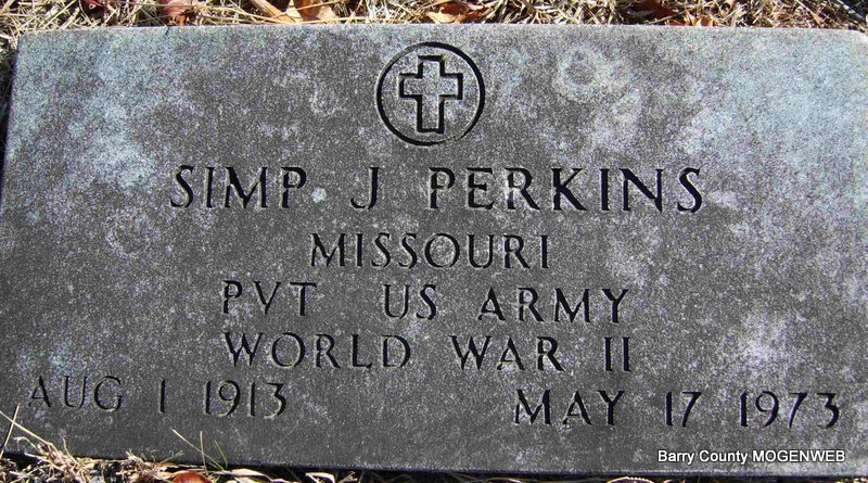 | PERKINS, Simp J. | Aug. 1, 1913 | May 17, 1973 | Inscription: "MISSOURI PVT US ARMY WORLD WAR II" - Research Note: Son of Wilburn Perkins and Martha Tankersley. | Census Phyllis Long Photo Deceased Beverly Sweeney |