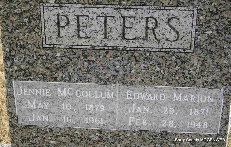 | PETERS, Jeanette "Jennie" (MCCOLLUM) | May 10, 1879 Seligman, Barry Co., MO |