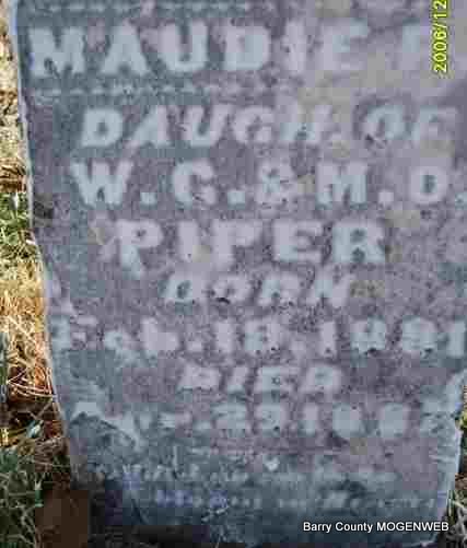 | PIPER, Maudie P. | Feb. 18, 1881 | Apr. 29, 1881 | Inscription: "Dau. of W. G. and M. O. Piper" | Photo Deceased Beverly Sweeney |