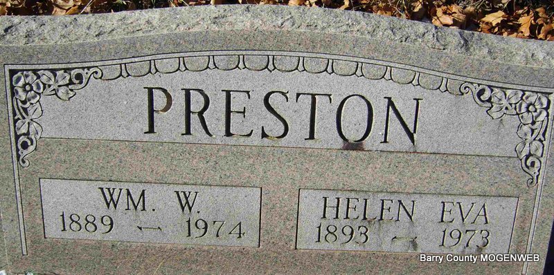 | PRESTON, William Walter | Dec. 31, 1889 | 1974 | SSW: Helen Eva - Research Note: Son of Sherman and Matilda (Phillips) Preston. She second married William Henry Lawrence and they are buried at Corinth Cemetery. | First Century of Seligman Phyllis Long Photo Deceased Beverly Sweeney |