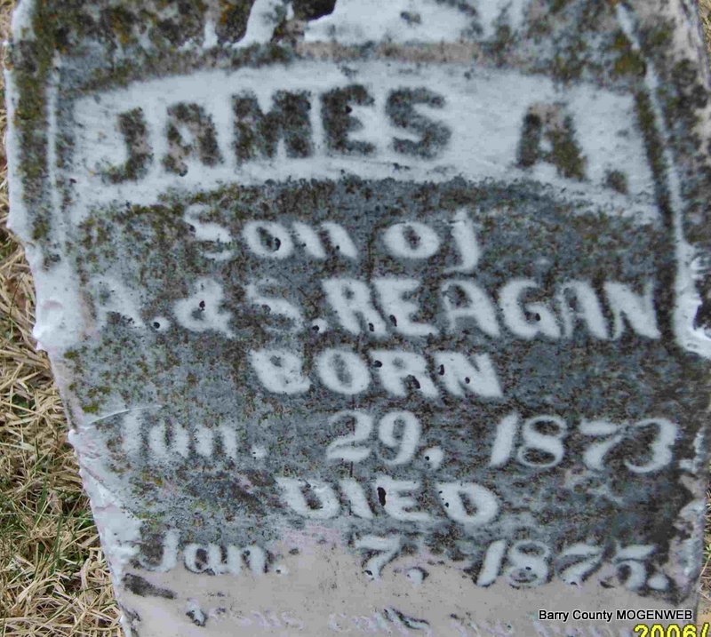 | REAGAN, James A. | Jan. 29, 1873 | Jan. 7, 1875 | Inscription: "Son of A. and S. Reagan" - Research Note: Parents were Abmires and Susan (Skelton) Reagan. | Note Photo Deceased Beverly Sweeney |