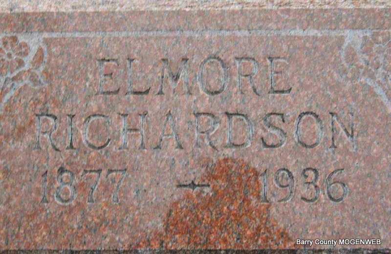 Research Note: His wife was Cora and she was the informant on the death certificate. He was a farmer and had worked in the lead mines, chronic lead poisoning was the cause of death. Son of G. J. Richardson born VA and mother's maiden name was "Angeline" Rutledge born IL. - 1930 Census, Barry County, Missouri, Roaring River Township - Elmore Richardson Male 52 Married White Head 1878 Illinois West Virginia Illinois; Cora E Richardson Female 30 Married White Wife 1900 Missouri Missouri Missouri; Angeline Richardson Female 73 Widowed White Mother 1857 Illinois Tennessee Illinois. | Death Certificate Census Phyllis Long Photo Deceased Beverly Sweeney |