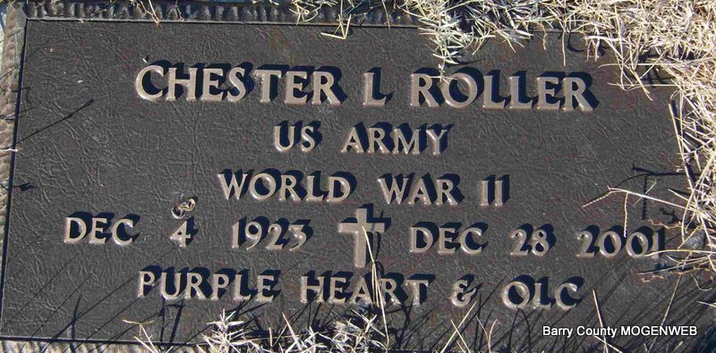 Inscription: "MISSOURI PVT 81 GEN HOSP WORLD WAR II" - Research Note: Usual address was 3 miles South of Washburn, Barry Co., MO. Son of James Monroe Roller born Seligman, MO and Sallie Skelton born Seligman, MO. He was single. His father was the informant on the death certificate. | Death Certificate Phyllis Long Photo Deceased Beverly Sweeney |
