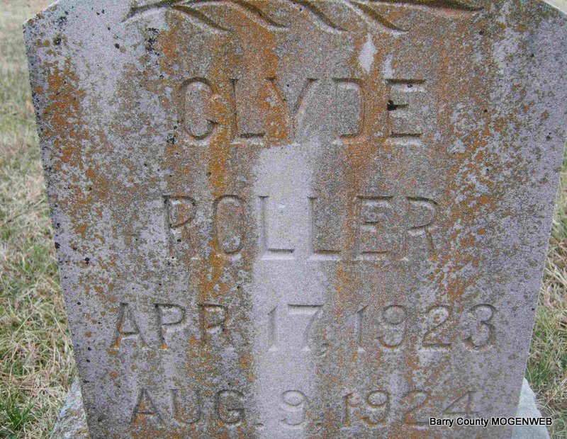 | ROLLER, Willie | May 29, 1910 | Sept. 15, 1919 | Research Note: Photo of stone at findagrave.com. Son of James Monroe Roller and Sallie Skelton. - Cassville Republican, July 17, 1919 - New Salem: Robt. and S. V. Roller and wives spent Sunday at Mon Roller's near Wayne. Mon's son Willie is suffering very badly with an abscess on his hip. - Cassville Republican, Sept. 18, 1919 - New Salem: Willie, son of Mr. and Mrs. Mon Roller, of near Wayne died Monday night Sept. 14th, after nearly 12 weeks of illness. Funeral services will be held at this place today, Tuesday, at 2 p. m. and interment made in the cemetery near by. The bereaved parents and relatives have our deepest sympathy. | Online Newspapers Phyllis Long |