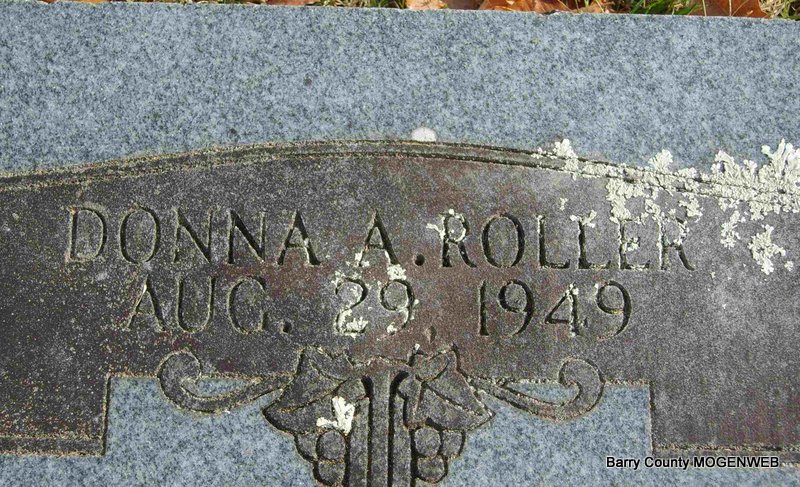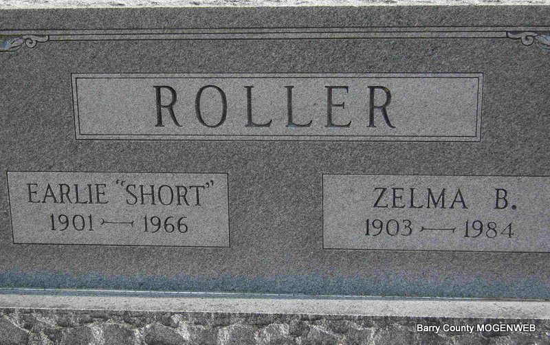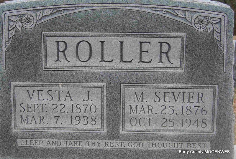 SSW: Vesta J. - Inscription: "Sleep and take thy rest, God thought best" - Research Note: His death certificate reads that his wife was named Vesta Skelton Roller and that he was born Mar. 25, 1875 and not 1876 as the stone reads. He had lived in Barry County for 73 years and was in the hospital 1 day. He was age 73 yrs., 7 months and 0 days old when he died. His usual address was Seligman, MO. He was a retired farmer, son of Elisha Roller, born TN, and Sarah Banks, born MO. Mrs. Leonard Turner, Star Rt., Shell Knob, MO, was the informant. - November 12, 1914, Thursday, Cassville Republican - New Salem News: Sevier Roller and family spent Sunday with his brother Monroe and family at Wayne. - March 16, 1916, Thursday, Cassville Republican - New Salem News: Sevier Roller and daughter, Oner, Dallas Summey and sister, Dema, and Misses Eunice and Trixie Hall, went fishing on Roaring River Sunday. - March 2, 1916, Thursday, Cassville Republican - New Salem News: Nathan Skelton has been sawing quite a lot of wood in this part. He expects to saw wood this week for Sevier Roller, Sam Fountain and General Brixey. - February 28, 1918, Thursday, Cassville Republican - Henry Skelton and family, Aunt Rachel Summey and Miss Cora Skelton were all visiting Sunday at Sevier Roller's. | Census Janet Lynch Death Certificate Donna Cooper Online Newspapers Phyllis Long Photo Deceased Beverly Sweeney |