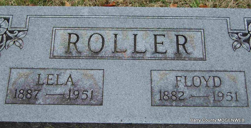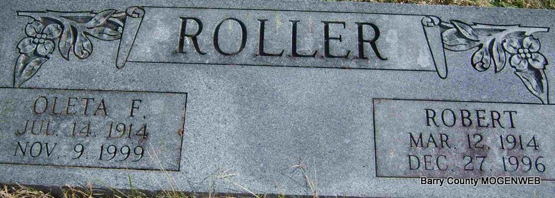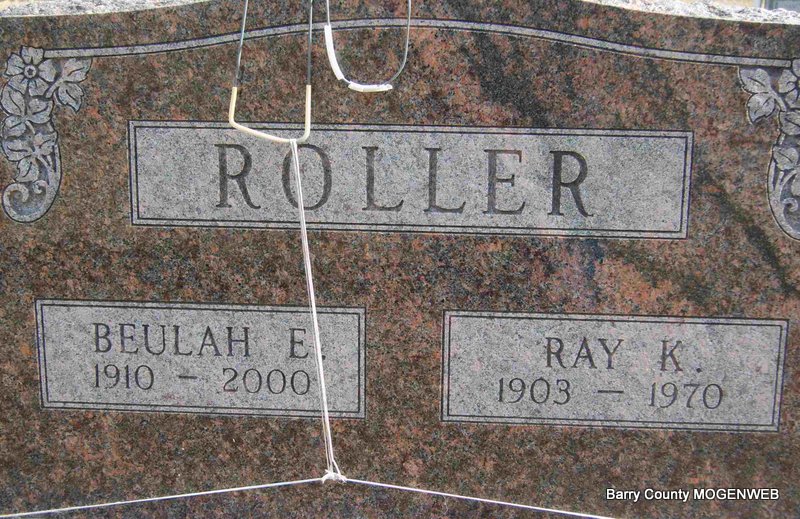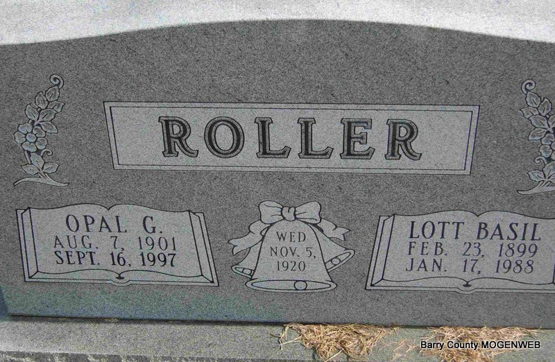 SSW: Opal G. - Inscription: "Wed Nov. 5, 1920" - Research Note: Husband of Opal G. (Barnes) Roller, son of Robert and Dorthula Roller. - March 2, 1899, Cassville Republican - Another News: Born to Mr. and Mrs. Robert Roller, a fine boy weighing twelve pounds. | Online Newspapers Census Phyllis Long Note Photo Deceased Beverly Sweeney |