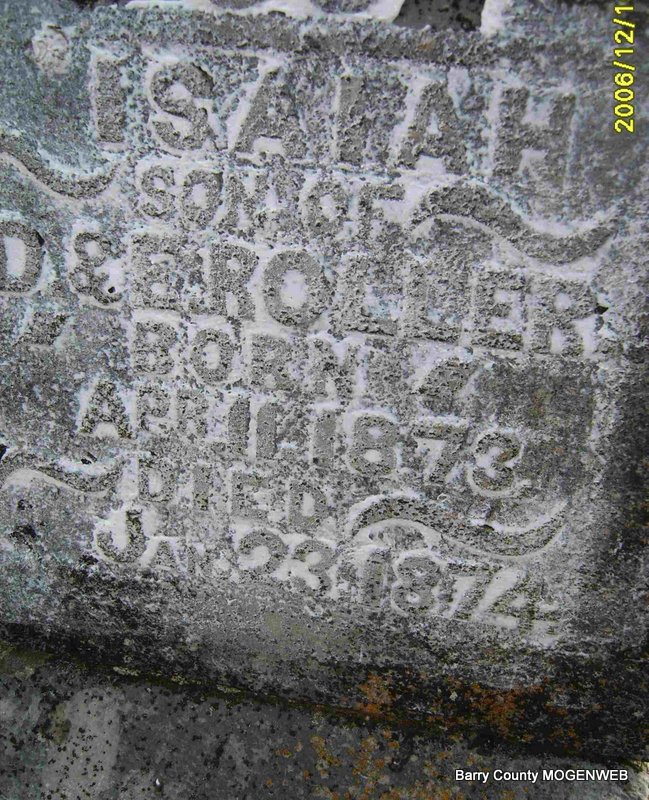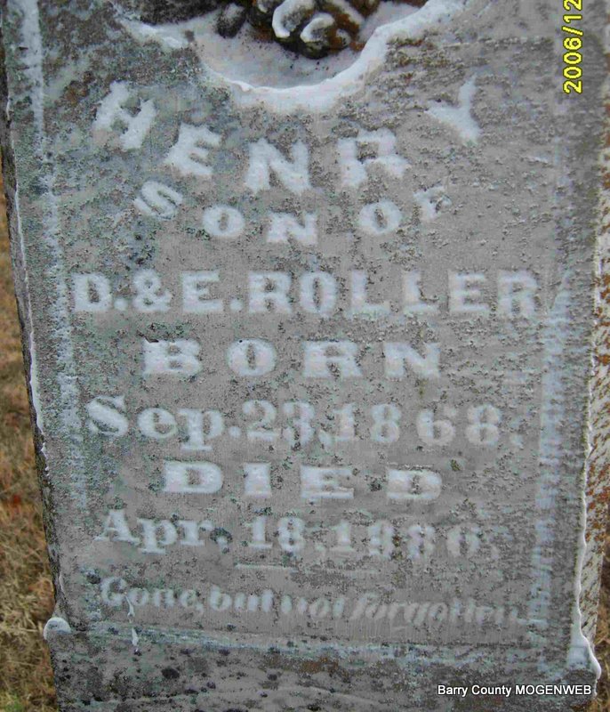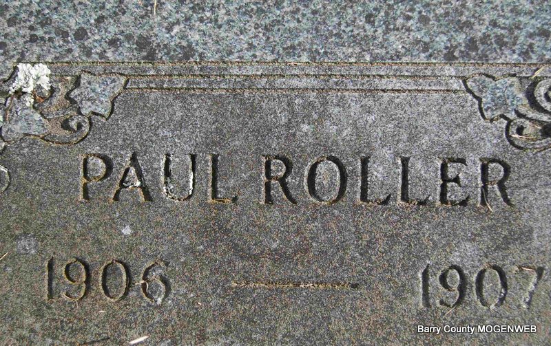 | ROLLER, Paul | 1906 | 1907 | Research Note: Son of Robert Roller and Dorthula Roller. - September 21, 1907, Saturday, Cassville Democrat - D. Roller and wife of this city attended the funeral of their nephew Paul, son of Robert Roller of near Seligman, Monday. | Online Newspapers Phyllis Long Photo Deceased Beverly Sweeney |