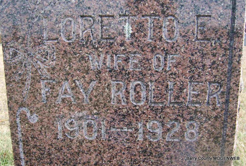 Inscription: "Wife of Fay Roller" - Research Note: According to her death certificate her father was Guy King and her mother was Catherine M. Cauliff/McAuliffe. Her birth date was given as Nov. 7, 1900. Her stone has 1900 as a birth year. Fay Roller of Joplin, MO, gave the information. - Joplin Globe - Mrs. Loretto E. Roller (spelled Rowler in the obit), 27 years old, wife of Fay K. Roller died at St. John's Hosp. at 11 a. m. this morning. she is survived by her husband, a daughter, Rosalee Roller; her parents, Mr. and Mrs. Guy King, and two sisters, Misses Hazel and Ellen King, 523 N. Joplin St.; four brothers, Earl King, Picher; George King, Pleasant Hill, MO; Raymond King, 1806 Byers Ave., and Edward King, 532 N. Joplin Street. Funeral arrangements are incomplete. | Death Certificate Donna Cooper Joplin Globe Phyllis Long Photo Deceased Beverly Sweeney |