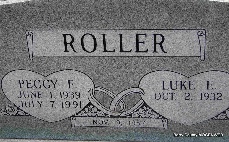SSW: Peggy E. - Inscription: "Nov. 9, 1957" - Research Note: Son of Edward Franklin Roller and Flora Jane Ash. On November 9, 1957 he was united in marriage to Peggy Roller, who preceded him in death on July 7, 1991. On September 1, 1996 he married Georgia (Catron) Pippin Douglas, who died January 8, 2014. Georgia is buried at King Cemetery. Also preceding him in death were his parents; two brothers, Harold and Norman Roller; one sister, Virginia Skelton and a niece, Bernita Brown. Luke received his education at Washburn where he graduated from high school. He then joined the United States Air Force, retiring as Master Sergeant on December 1, 1971 after twenty years of service. During that time he was stationed in Oklahoma, the East Coast and served in Vietnam. After his retirement he moved back to Missouri and farmed in Seligman. | Census Phyllis LongPhoto Deceased Beverly Sweeney |